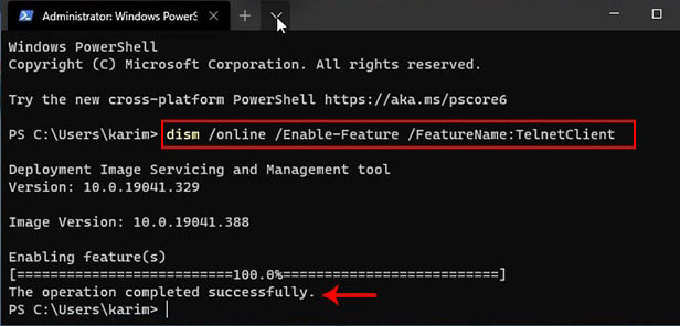 You can also easily execute the following command from the command prompt "cmd" or "Powershell", which will activate the "Telnet Client" feature on the system directly: